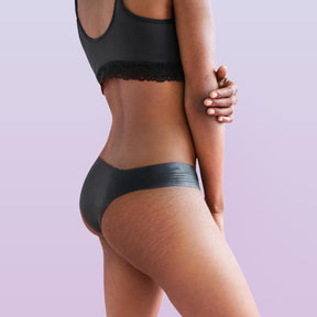 Lorals model Amanda demonstrates the front view of STI Protection Undies in Black Bikinis