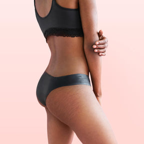 Lorals model Gladys demonstrates the back view of Pleasure Undies in Black Bikinis